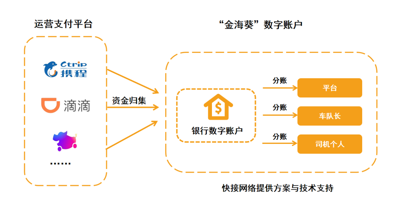 痛点 某出行平台,在多个平台需处理到大量交易订单,资金来源分散,不同平台的收款资金无法归集,较难以统一管理,且涉及到众多分账方等。