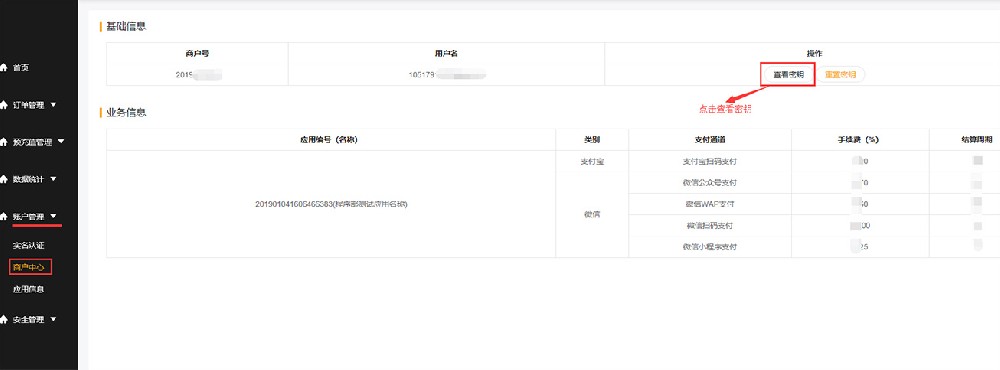 1、进入账户管理-商户中心,点击查看密钥